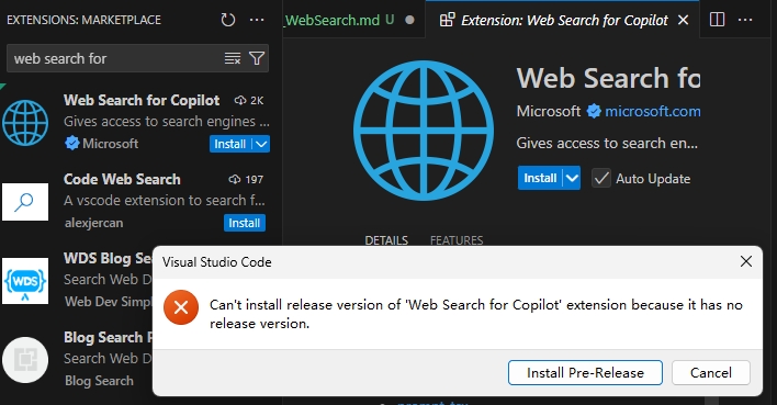 在 VS Code 的 Extensions 中搜索 "Web Search for Copilot" 插件,然后安装它。因为当前版本是 v0.1.2024111101 (pre-release) ,所以在安装过程中会弹出提示“Can't install release version...”。